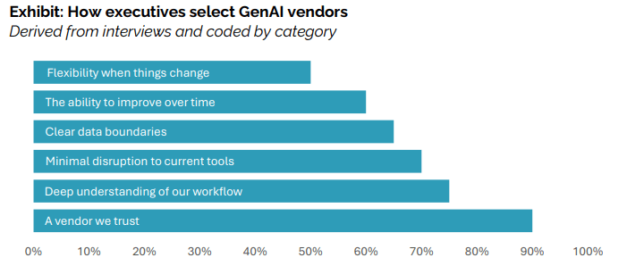 Going back to the MIT report, the report suggest a few criteria for GenAI vendors to be successful as well as a few tips for companies / corporates to successfully reap ROI from their Gen AI investment. For GenAI vendors to be successful, a strong relationship / trust with the client is still key; in additional, these vendor should have a deep understanding and smooth integration into the existing workflow of their client companies.