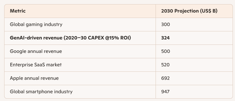 “at $324 billion, GenAI‐driven revenue would just surpass the global gaming industry yet remain well below the revenues of enterprise SaaS, Google, Apple or the smartphone market. Hitting that level by 2030 implies GenAI must carve out a revenue stream on par with a top entertainment segment—entirely plausible given AI’s rapid adoption in sectors like media, healthcare, finance and manufacturing. However, this scale still trails broader tech markets, underscoring that while a $324 billion annual payoff is ambitious, it sits squarely within the realm of achievability if generative AI unlocks high-value, monetizable applications across multiple industries.”